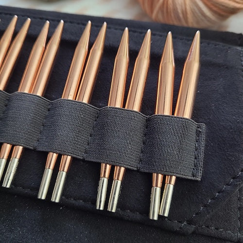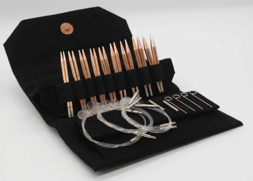 LYKKE Cypra 3.5" Interchangeable Needle Set.  LYKKE Cypra Needles are made of copper which is smooth and light and will naturally patina over time without staining your projects. You may also polish them to that bright, new copper finish without any effect on the stitch quality.  Created with the new Lykke clear swivel cords for flawless & enjoyable knitting.
